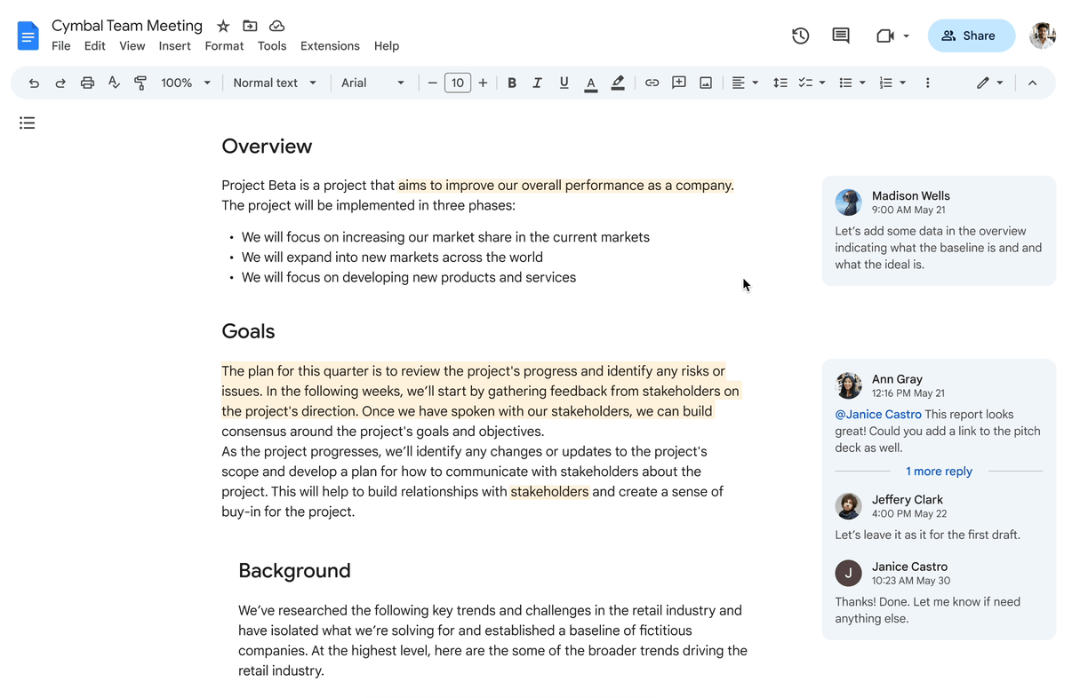 Presentamos una experiencia mejorada de comentarios. Te ayudará a encontrarlos y actuar fácilmente. Esto aplica en Docs, Sheets y Slides. Disfrutarás de la experiencia familiar de comentarios. Pero notarás actualizaciones en las tarjetas. También en íconos y otros elementos.