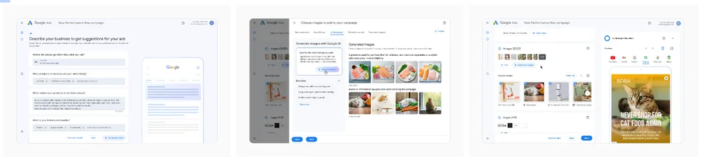 Imagen del nuevo flujo de creación de activos para Performance Max, incluidos los activos de imagen creados por IA generativa.