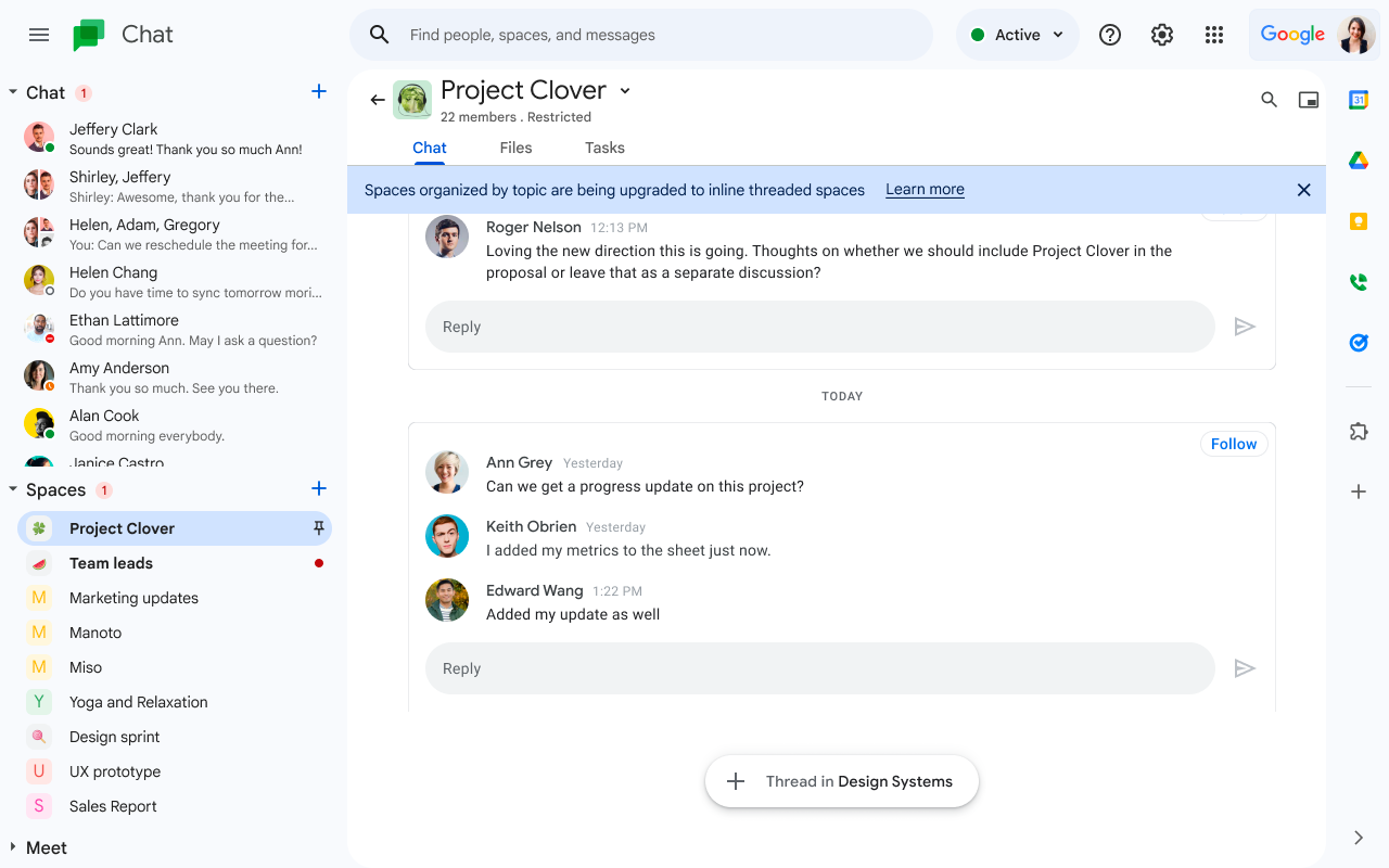 Para mejorar aún más la experiencia de subprocesos en línea, presentaremos varias funciones nuevas durante el resto del año y hasta 2024. Aquí hay una vista previa de algunas de esas funciones; asegúrese de suscribirse al blog de actualizaciones de Workspace para obtener las últimas actualizaciones. según disponibilidad. Mientras tanto,