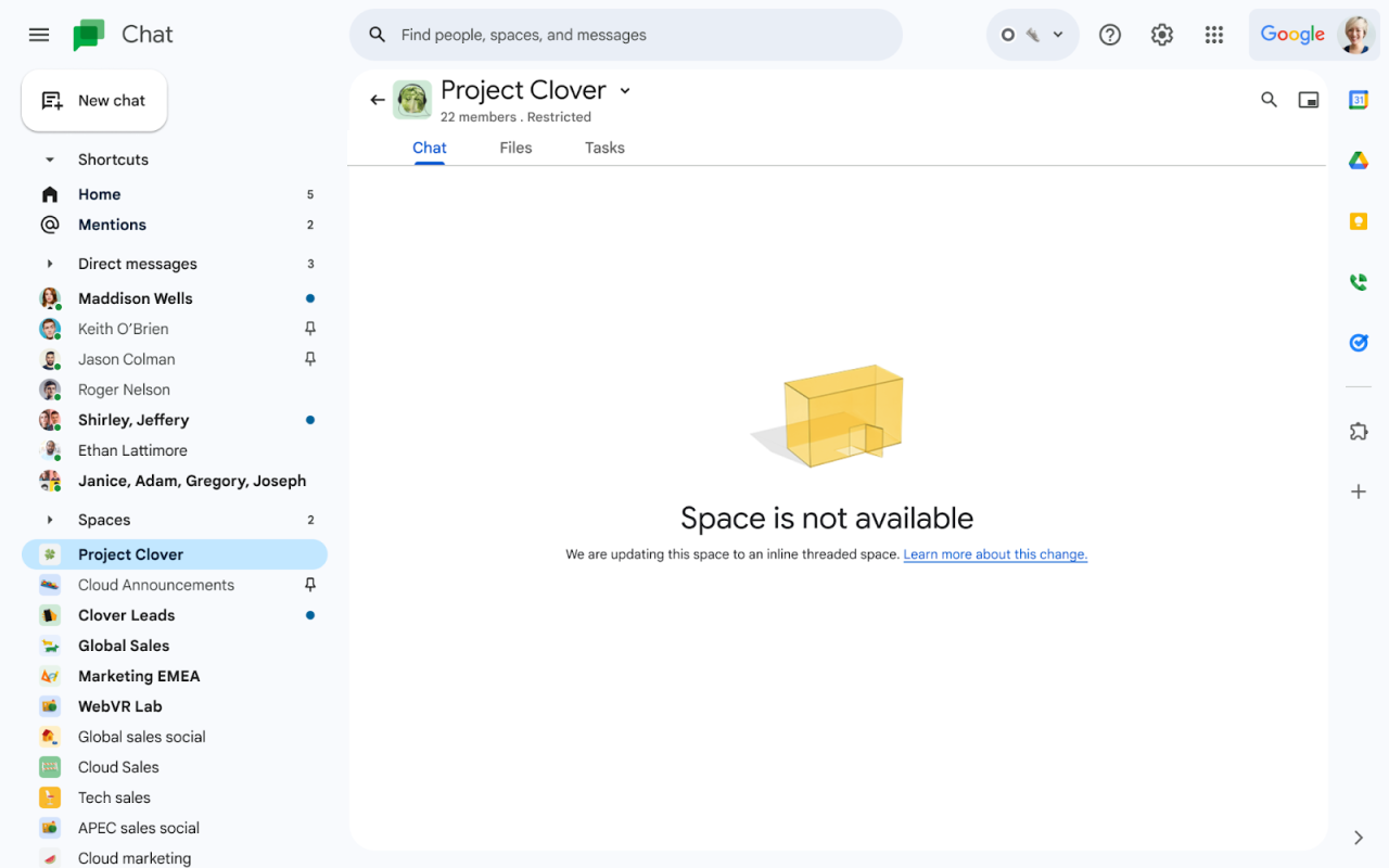 Como se mencionó anteriormente, planeamos ejecutar estos cambios durante las horas de menor actividad para ayudar a minimizar las interrupciones. Si está utilizando un espacio afectado cuando comience la actualización, la mayoría de las funciones, como enviar y recibir mensajes, serán inaccesibles. Normalmente, esto sólo durará unos minutos, después de los cuales los usuarios simplemente tendrán que actualizar la pestaña del navegador para acceder y utilizar el espacio recién actualizado. Otros mensajes directos, conversaciones grupales y espacios en línea no se verán afectados y permanecerán accesibles durante la actualización.
